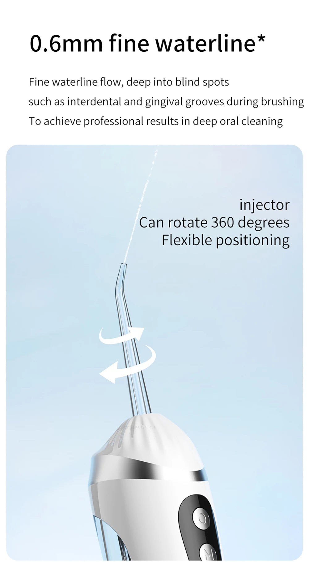【Your Oral Care Expert】 introduces the latest powerful whitening floss. Strong power upgrade version, using independent voltage stabilization system to emit high-frequency pulse water flow (up to1600 times per minute), 360° clean mouth without dead ends
